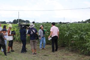 収穫最盛期を迎えるオクラの圃場にて辻岡義堂アナウンサーにおいしいオクラの見分け方の伝授やオススメのオクラ料理を紹介。生中継直前に夕立が発生し放送時間が変更になるなどハプニングも発生しましたが、しおのや産のオクラをPRすることができました。