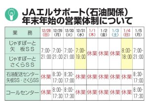 JAエルサポート(石油関係) 年末年始の営業体制について